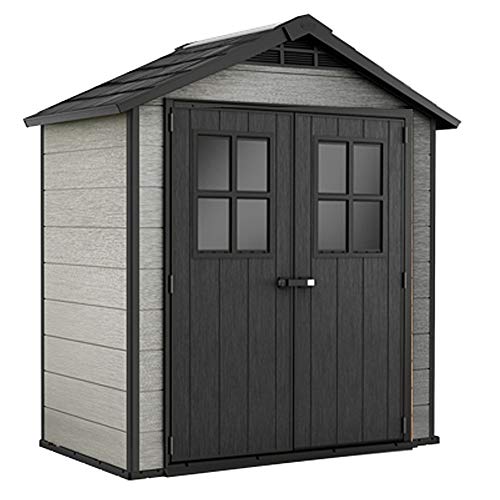 日本製にもよくある四角い機能性重視の物置小屋ではなく、形がかわいらしくドアや窓のデザインが人気の小屋タイプの物置です。組み立てサイズは入り口側の幅が233.6cmで奥ゆきは94.6cm。