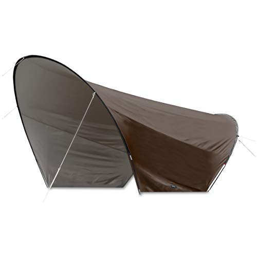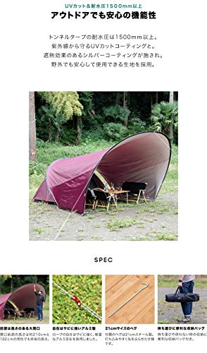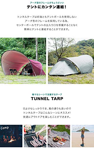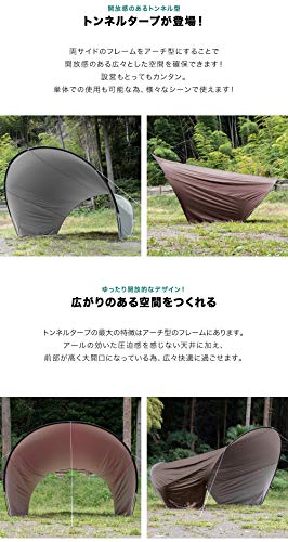 フィールドア以外ではあまり見かけない珍しい形状のタープです。出入り口となる部分が弧を描いていてトンネルのようになるため目隠しになりますよ。小さなテントだとそのまま連結ができ、前室を簡単に追加できるユニークなタープとなります。