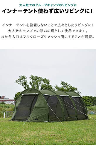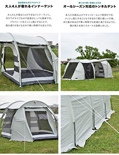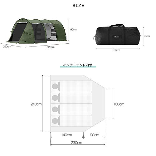 低価格ですが、人気ブランドと同じように快適で設営しやすいトンネル型の2ルームです。620×260cmの大きさがありインナーは大人3~4人で使える広さがあり、インナーのサイドはメッシュになっていて通気性が高いです。有名ブランドの2ルームと同じようにきちんとメッシュ、フルクローズができ、フライシートにはスカートもあります。