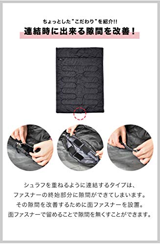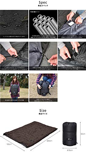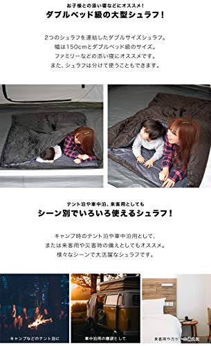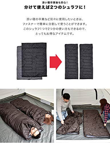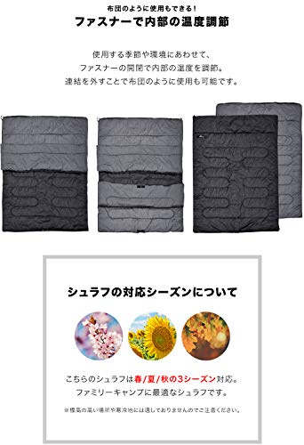 ファミリー向けのダブルサイズの寝袋です。大きいシュラフだと高価なものが一般的ですが、3シーズン向けにすることで低価格の寝袋として発売されていますよ。子どもと添い寝ができる150×200cmとゆとりのあるダブルサイズで非常に使いやすいです。子どもが大きくなると2つの寝袋に分割できる点も評価が高いです。