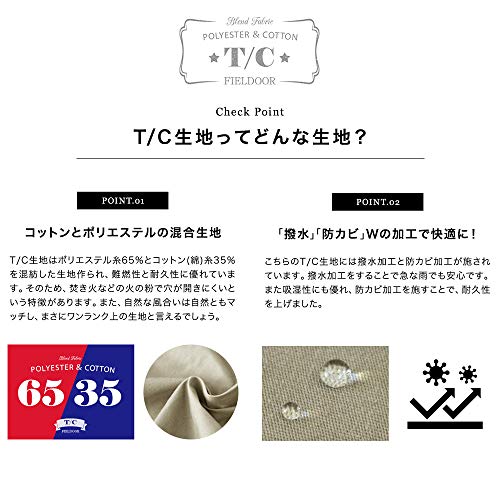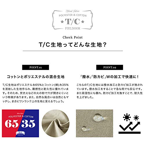 また、撥水加工のあるT/Cのため水を吸いにくく、汚れを落としやすくなっていたり、防カビ加工が施されていてフィールドアらしい高機能な製品です。