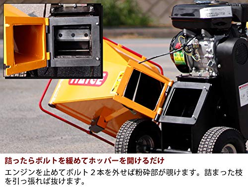 運転時・メンテナンス時の安全性を確保するための2種類の安全装置も付いていて、初めての方にも安全に活用できます。エンジンを止めてボルト2本を外すことにより粉砕部を覗く事もでき、詰まった枝木を引っ張って抜く事も可能です。