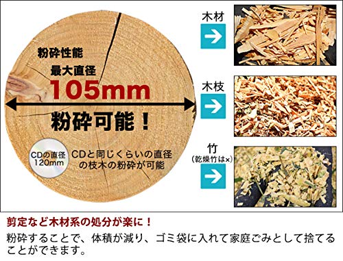 | 仕様 | 電源:100V (50Hz/60Hz)、消費電力:1500W、電流:15A、定格時間:約45分、最大粉砕能力:生木小枝φ25から35mm |