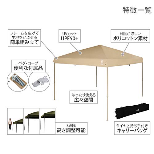 簡単タープとも言われている設営がしやすいタープです。他社からも発売されていますが、DODはワンタッチ式では珍しいTCタープになっています。ポリエステルの屋根と比較すると遮光率が高く、タープの下が涼しいですよ。また、通気性が高く屋根の内側に湿気がこもらないようになります。