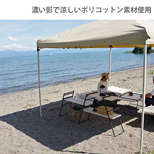 誰でも簡単に素早く設営できるLサイズのワンタッチタープです。基本的な仕様や使えるシーンはMサイズと変わらずデイキャンプや庭キャンプ、バーベキューや運動会などのイベントで使いやすいタイプです。Mサイズと比較すると横幅、奥行きのサイズがそれぞれ1m大きくなり3×3mになっています。