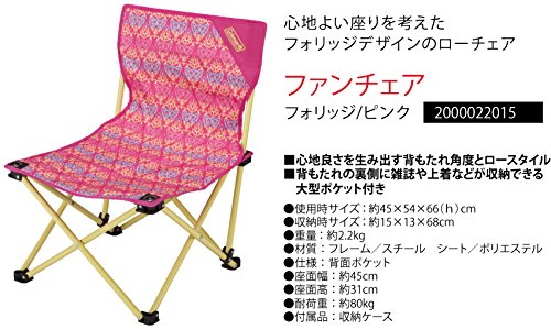 鮮やかな模様が特徴なファンチェアも、コールマンで販売中のおすすめ商品です。このローチェアはピンクとブルーの2つのカラーがあって、見るからにかわいい印象。54×45×66cmというコンパクトなサイズで、座面高を見ても31cmと低めです。女性や子どもが好む見た目のチェアは、かなり低価格なので入手しやすい感じになっています。