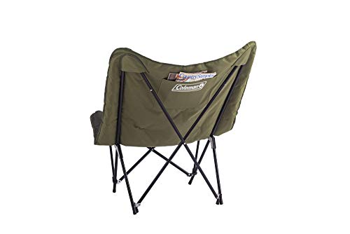 椅子の背面側にはコールマンのロゴマークが大きく記されていて、キャンプで日差しを遮るための帽子や、焚き火の準備をする時に使う防火手袋などを入れておけるポケットがあります。