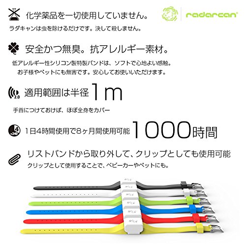 無臭で抗アレルギー素材を使用しており、ペットなどの動物にも無害。低アレルギー性シリコンバンドは柔らかく心地よい感触となっています。カラフルなシリコンバンドウォッチのように身につけて虫除けできるので、キャンプ地へ出掛ける前から身につけておくことがおすすめです。