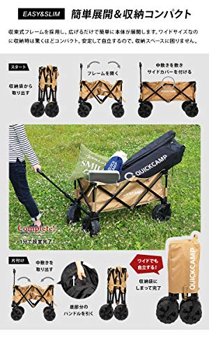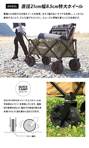 アウトドアギアの人気ブランド・クイックキャンプのワイドホイールアウトドアワゴンは、タイヤが21cm径の大型ホイールで、砂などがある道でもぐんぐんと進んでいくことができる使いやすいキャリーカートです。