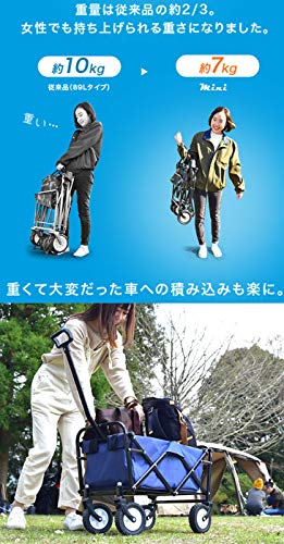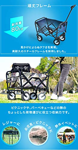 重さが7kgと軽量なアウトドアワゴンになりますので、使っていない時には女性にも運搬しやすいです。耐久性に優れているスチールフレームを採用していることにより、耐荷重が80kgまで問題なく、見かけ以上にタフな作りのキャリーカートです。