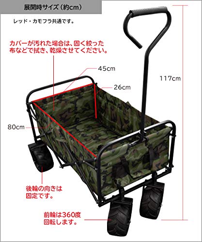 10cmの大型タイヤを装備しているため、悪路でもぐんぐんと進んでいる4輪カートで、キャンプ場の地面が砂であっても使いやすいです。選び方ではブラックとレッドの2種類のカラーより比較して決めることができます。お値段も比較的安い商品で、口コミでも良い評価がたくさん投稿されています。