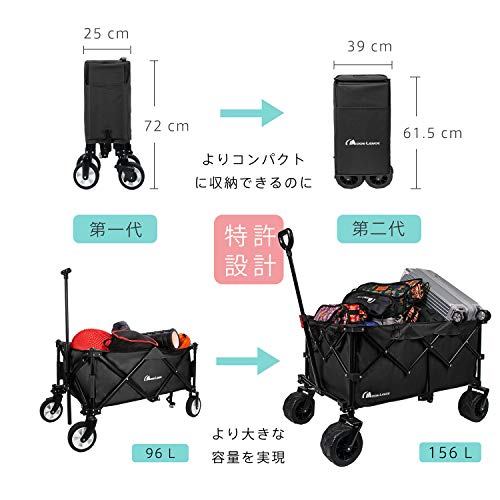ムーンレンスというキャンプギアブランドより販売されている折りたたみ式の人気キャリーワゴンで、156Lの大容量サイズになりますので、一度に大量の荷物を運びたい時にも非常に使いやすい商品です。