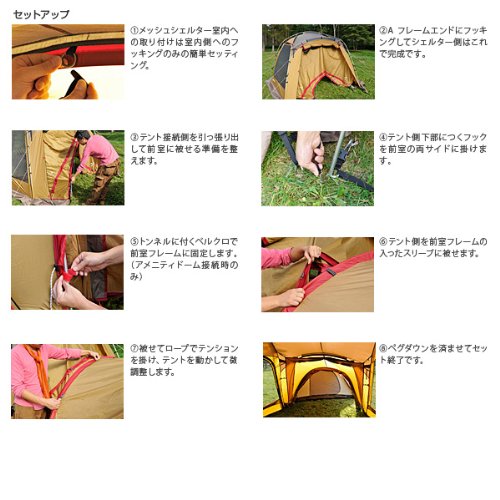 トンネルアイテムの取り付けには、若干コツが必要です。だから買い求める前に、予習しておくのがおすすめ。新型・旧型メッシュシェルターに加えて、アメニティドームを手に入れ、豪快にキャンプをしてみたいなら見逃せません。