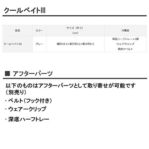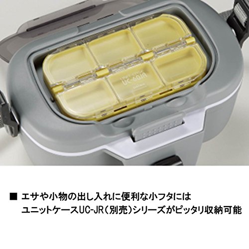 幅約18.5×奥行約12×高さ約8.5の釣り餌箱道具は、ハーフトレイを装備し餌を小分けにする事が可能な仕様。首掛け式の餌箱ですが、餌箱を安定させる仕組みで餌漏れの心配はありません。別売りのユニットを装着する事で小物の収納も可能になります。