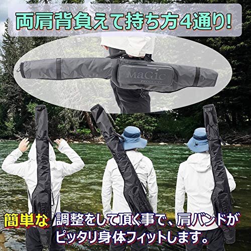 両肩で背負う事ができますので、渓流用の釣竿、イカ釣り用のエギングロッド、投げ釣り用のショアジギングロッドなど、種類多くのロッドを入れて楽に持ち運びできます。