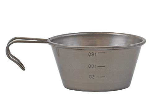 snowpeakのチタンシェラカップ(E-104)は先述したE-103のチタン版。持ちやすさはE-103に軍配があがるものの、目盛りがmⅼとozの2表示なのがE-104のおすすめポイント。米1号は6oz相当ですので、ソロキャンプでの炊飯では計量カップとして使えます。軽量ですので人力移動のソロキャンプにおすすめです。