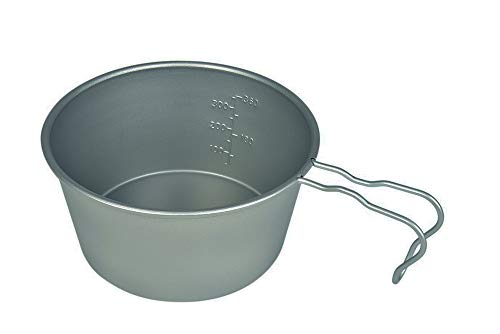 エバニューのチタン製シェラカップは、煮込み料理が作りやすいように高さが8cmもあります。目盛りの表記が2パターンあるので、お好みの表記で量ってください。また、取っ手部分にはラバーがついています。