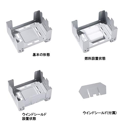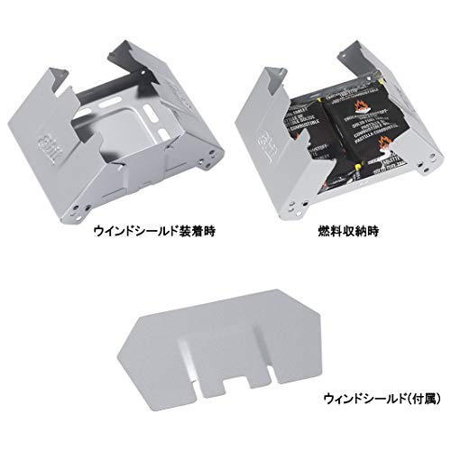 やや大きくなったポケットストーブになりサイズは115×86mmです。重さは総重量で176gになります。素材は電気亜鉛メッキコーティングスチールです。本品はミディアム専用の風防が付属し、耐風性が増していてよりアウトドアで使いやすくなっったモデルになります。