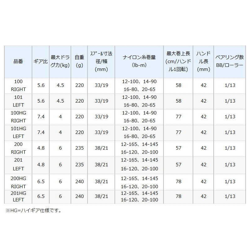 モデル展開は33mmスプールの100/101、100HG/101HG、38mmスプールの200/201、200HG/201HGの8機種構成からスタート。やや軽めからやや重めまで、使用頻度の高いところを満遍なく使えるラインナップです。