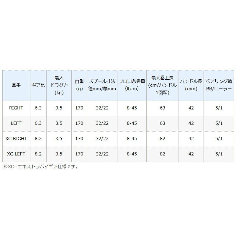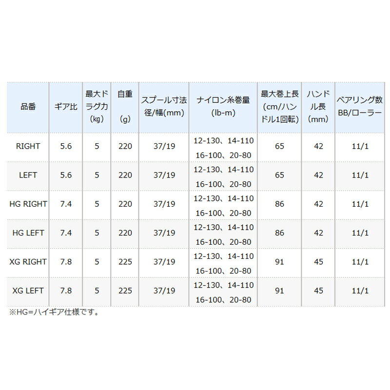 基本スペックは「16アンタレスDC」と同じくラインキャパシティ16lb100m、自重220g、最大ドラグ5kgとほぼ同一。XGがラインナップに追加され海水OKに、ハンドル受軸部分のベアリングが1つ追加されたというのがスペック面での変更点になります。
