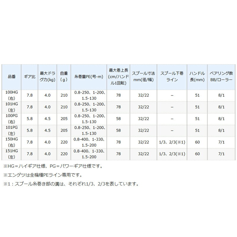 ラインナップは100PG/101PG、100HG/101HG、150HG/151HGの3モデルで、スタイルに合わせた選択が可能です。春から秋までのスタンダードなタイラバには100PG、ディープタイラバには150HGがおすすめです。100番クラスは51mmダブルハンドル、150番クラスは60mmのシングルハンドルとこの部分の違いもチェックしておきましょう!