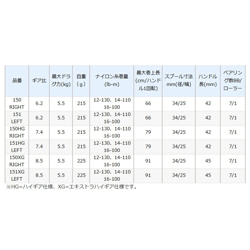 ラインナップは150/151、150HG/151HG、150XG/151XGの全6モデル構成。ラインキャパシティは16lb100mです。バス向けのルアーに幅広く対応できるスペックで、ミドルクラスからヘビークラスまでのルアーにピッタリ!塗装までソルト仕様になったことで、シーバスやロックフィッシュゲームでも活躍してくれそうです。I-DC5にはPEモードもあるので、ソルトアングラーの方もぜひ検討してみてください。