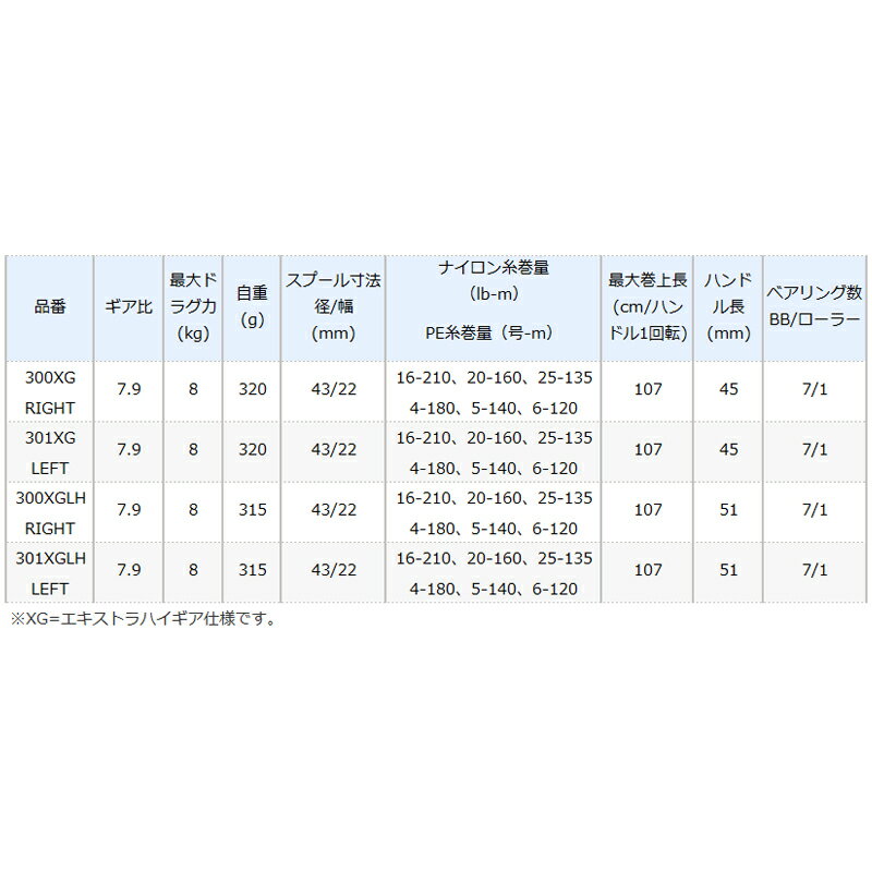 ラインナップは7.9:1の300XGのみですが、LH(ロングハンドル)モデルを加えた全4モデルの構成です。ラインキャパシティは20lb160mで、25lbでも135mを確保可能。PEラインは5号140mと磯での青物にも使える大型のスプールを搭載しています。ドラグ力8kgというスペックはこのタイプのリールの中でトップの数値なので、ビッグゲームが好きな方はジャンルを問わず要チェックです!