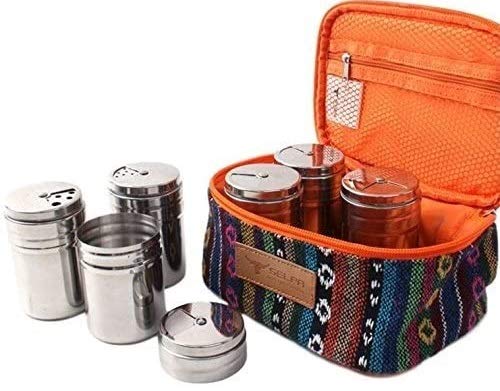 こちらは150mlサイズのステンレススパイス入れが6個とそれがピッタリ入る収納・持ち運び用のバッグがセットになったアウトドア向け調味料入れ。