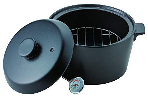 美濃焼の美しい陶器製の日本製コンパクト燻製器です。落としたりぶつけたりすると割れてしまうことを考えると家の中での使用がおすすめの燻製器です。同じく日本製の美濃焼の姉妹品と比べると平らな蓋で温度計が食材に干渉しにくい構造で、温度計が付属し使いやすいおすすめ燻製器です。