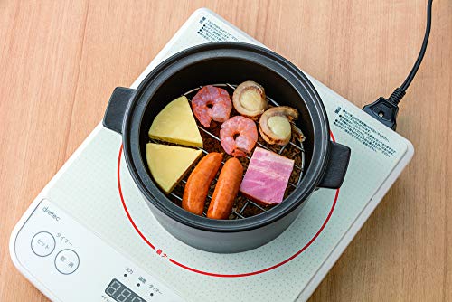 これまで陶器だと反応したり、しなかったり、焦げ付く原因になっていた電磁調理器の動作不良をなくし、安定して使えるようになった陶器の燻製器です。生産国はマレーシアになります。構造は前述した陶器の燻製器と似ていて陶器の鍋に網を置くだけです。