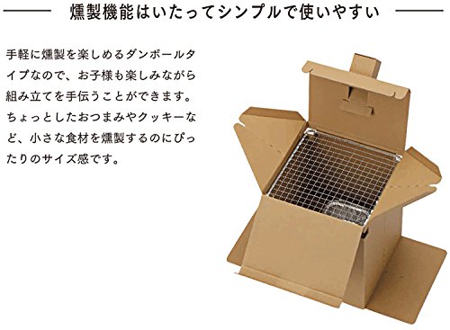 小型のコスパのいいダンボール燻製器です。前述したダンボール燻製器と比較するとコンパクトになって、デコレーションシールが付属し子どもと一緒にデコレーションを楽しみながら燻製ができる魅力があり、他社にはないユニークな燻製器になっています。