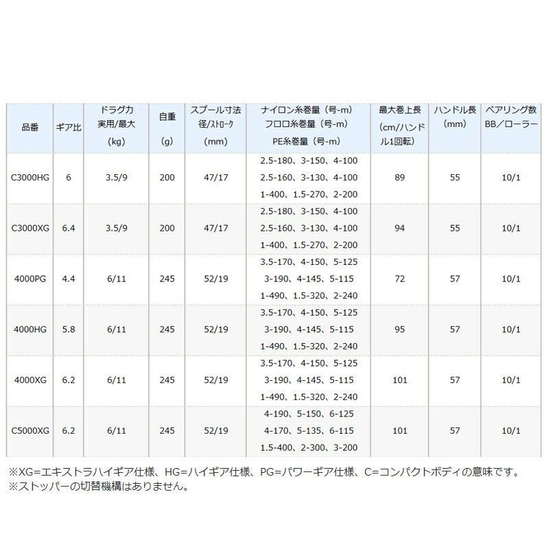ラインナップはC3000HGからC5000XGまでの全6モデル。4000番のみパワーギアのラインナップがあります。ハンドルノブは全サイズ丸形ですが、3000とそれ以外でサイズに違いがあるので、この部分も含めて番手を検討してみてください。自重は「20 ツインパワー」と比較すると、各番手ローター分で15gほど軽いです!