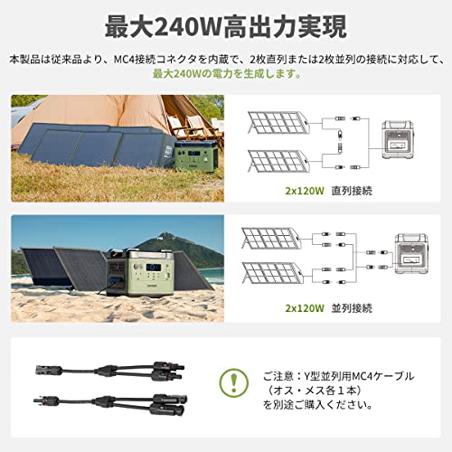 また、こちらのソーラーパネルはポータブル電源との併用が可能。キャンプで冷房器具や暖房器具を利用するという方は、事前にポータブル電源との互換性を確認しておきましょう。