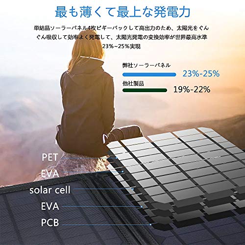 規則正しく並んだ単結晶セルパネルにより、効率的にソーラー充電ができる便利な商品です。25%の変換効率があるので、他の商品と比較しても特に早くモバイルバッテリーやポータブルバッテリーに充電できます。