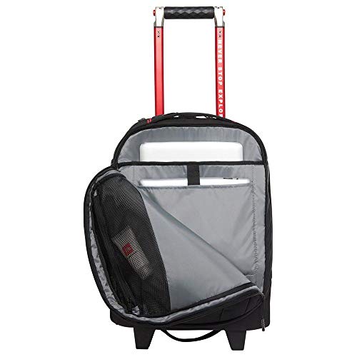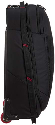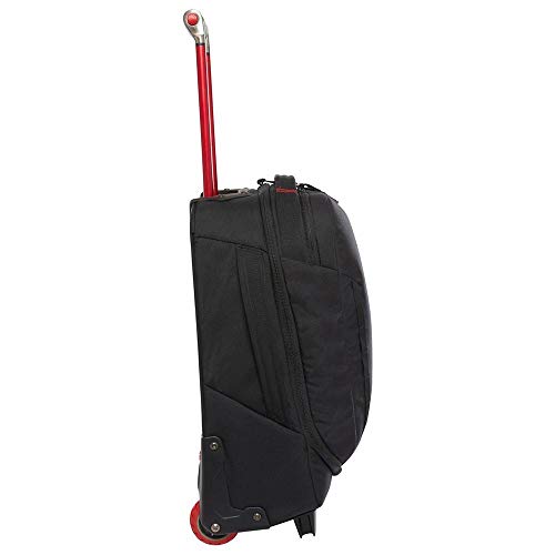 キャリーバッグの下部に付属している大型の2輪ホイールには、底足を添えることでしっかりと自立させることができます。ノースフェイスの他のバッグを吊り下げるベルトもついていて、充実したギミックも魅力です。