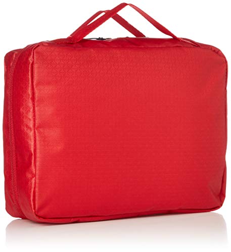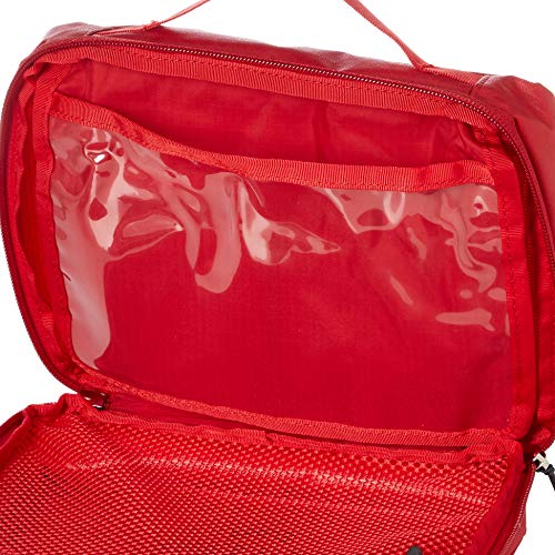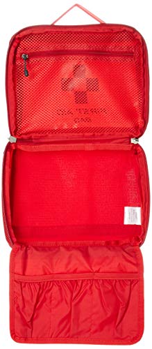 大きく開くように設計されていて、中身には小分けもしやすいポケットや通気性の良いファスナー付きメッシュポケットがあります。正面にはザノースフェイスのブランドロゴや商品名がプリントされているポーチです。