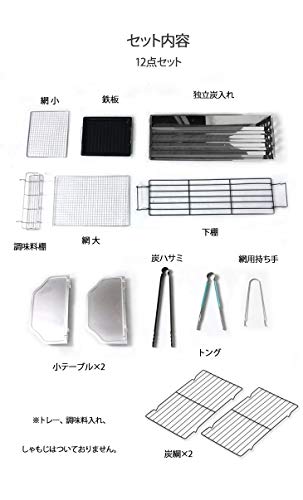 | 素材 | 本体・小テーブル・独立炭入れ・網用持ち手・トング:ステンレス/炭網:スチール/網:クロームメッキ銅/鉄板:鋳鉄/下棚:メッキ/調味料棚:アルミニウム合金/炭ハサミ:鉄電着塗装 |