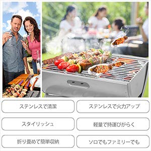 | 素材 | 本体・底板: ステンレス鋼、バーベキュー網・目皿・スタンド: 鉄(クロムめっき) | 本体・炭受け・炭ストッパー:430ステンレス鋼、ゴトク・ロストル:201ステンレス鋼、収納バック:ポリエステル | 本体/ステンレス鋼板、脚・網/鉄(クロームめっき)、炭受け/ステンレス鋼板 | 本体・小テーブル・独立炭入れ・網用持ち手・トング:ステンレス/炭網:スチール/網:クロームメッキ銅/鉄板:鋳鉄/下棚:メッキ/調味料棚:アルミニウム合金/炭ハサミ:鉄電着塗装 | スチール | 本体/スチール(アクリル樹脂焼付塗装仕上げ)、ハーフ網/ユニクロメッキ、脚/メラミン樹脂焼付塗装、スライドハンドル・取手(本体・鉄板)/クロムメッキ | ステンレス | 本体/鉄(焼付塗装)、目皿・ハンドル/ステンレス鋼、脚/アルミニウム合金、バーベキュー網/鉄(クロムめっき) | ステンレス、スチール、アルミ |