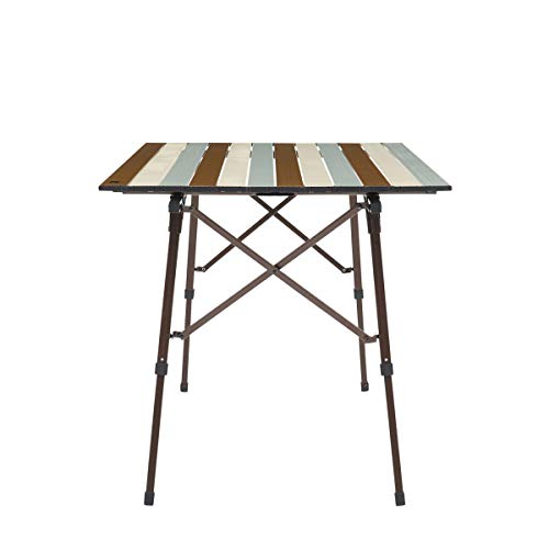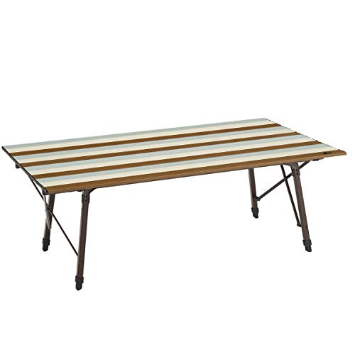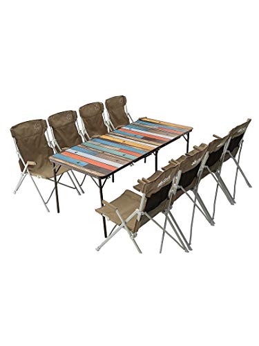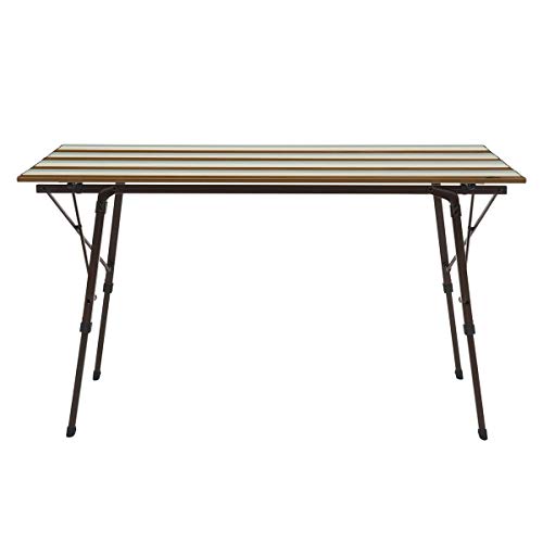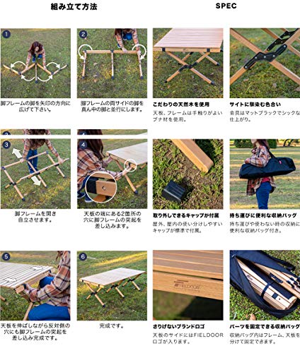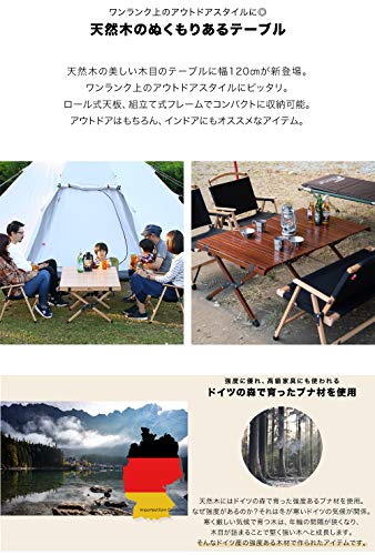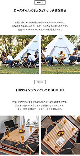 グループキャンプやファミリーキャンプの多いキャンパーです。写真手前が私の買ったフィールドアのロールテーブルで奥のテーブルが友人のハイランダーのロールテーブルです。テーブルのトップの木の質感使用感は全く差がありません。民族柄のテーブルクロスをひくと良い感じです。ガタつきも一切無く快適に使用してます。天然木ですので少々重いですね。4人で使うと手狭にはなりますがこうして2つ並べるとサイズ企画がほぼ同じなのでとても広いです。