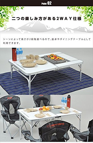 もちろん、普通のテーブルとしても利用できるので、いろいろなシーンで大活躍間違いなし。アルミ製なので耐久性に優れ、天板耐荷重も40kgなので安心して荷物を置けます。収納袋付きなので簡単に収納でき、持ち運べますよ。