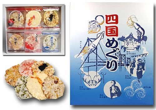 四国めぐりは特産の海産物をふんだんに使ったせんべいです。ひと箱にカニや紅たこ、海老、のり、イカ墨・のり・漁火の6種類がセットになって入っています。さくら海老が丸ごと入っているのも本格的、イカ墨がイカの形にプレスされているのも楽しい趣向です。