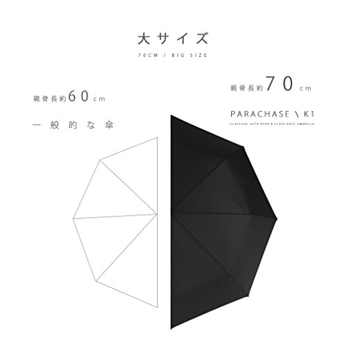 パラチェイスの折りたたみ傘は、親骨長が約70cmで弧長が140cmながら、自動開閉式の折りたたみ傘です。大柄な人が十分に使用に耐える傘になっています。