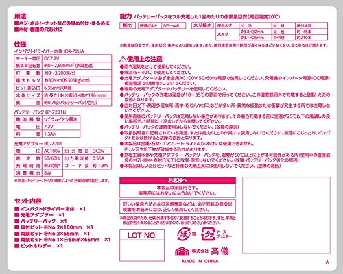 | 仕様 | 電源/コードレス、電圧/7.2 V、トルク/30 newton_meters |