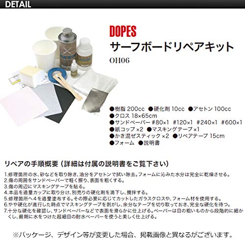 DOPESリペアキットは本格的にサーフボードを補修できる商品です。補修に必要な道具がすべて揃っており、リペアの手順が書いてある説明書も同封されています。価格は約3,000円と少し高めではありますが、レジンの量も多く、何度も補修に使いたい人向けです。