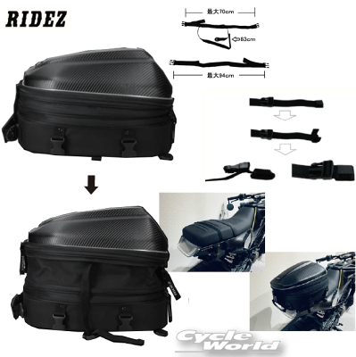 RIDEZのRTS03トランスポーターは、衝撃からも大切な備品を守れるハードシェルシートバックになります。中にフルフェイスヘルメットも収納できるシートバックで、ツーリングにも最適です。ファスナーを開くと2段階で拡張することもできます。