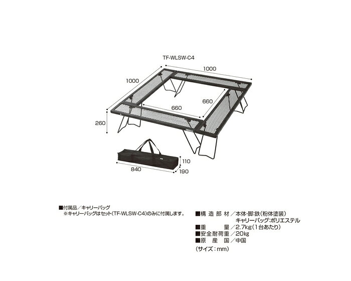 正方形に組んで囲炉裏テーブルとして使用すこともできます。単体でリビングにおいてもインテリア効果抜群です。脚部は折りたため、バラして付属のおしゃれなキャリーバッグに収納するとコンパクトになり持ち運びが楽になります。