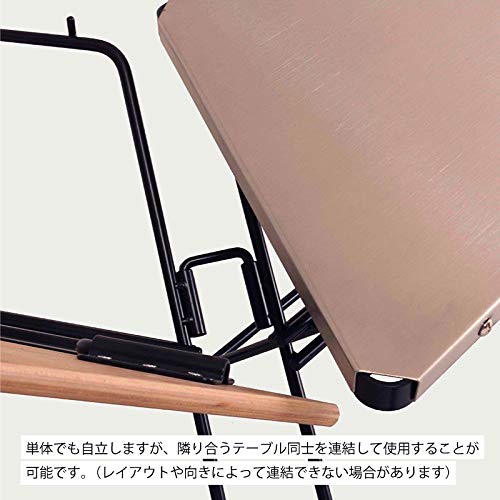 こちらはサイズが68×30×27cmで、素材が天板が木製、ブラックのフレームはスチール素材でできています。重量は一つ2kgで折りたたみが可能です。フレーム部分にひっかけられるパーツがついているため、それを連結して使います。