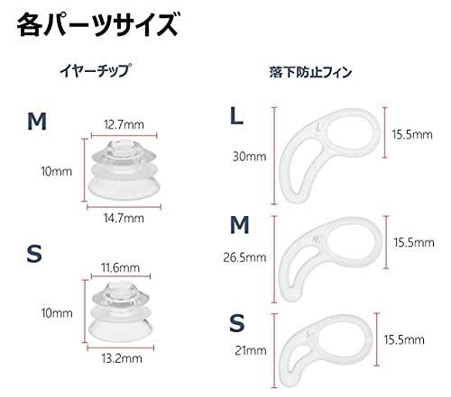 | セット内容 | 落下防止フィンBIG/SAMLL、イヤーチップBIG/SAMLL、コア、リーシュコード | 4サイズのシリコンソフトチップと2サイズのウィング、リーシュコード | 本体、ケース | 本体、収納ケース | 本体、収納ケース、リーシュコード | 本体、収納ケース | ||