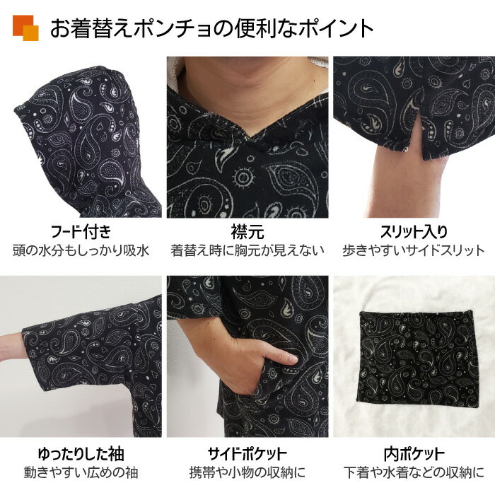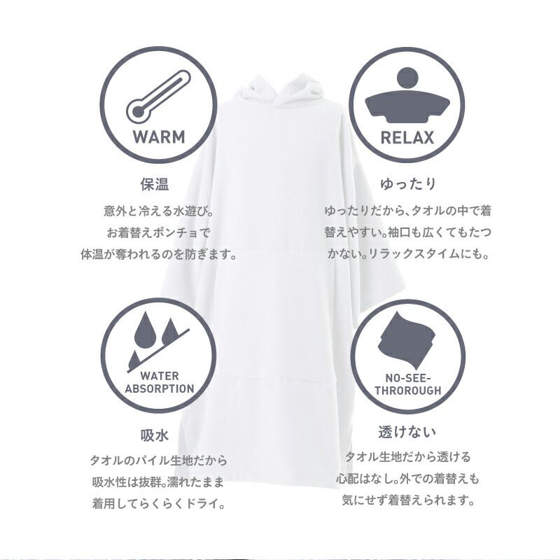 タオル生地なので透ける心配もなく、夏場のビーチでも他人の目を気にせずに着替えができるポンチョです。前側には大きなポケットがついていますので、小物を収納しておけます。