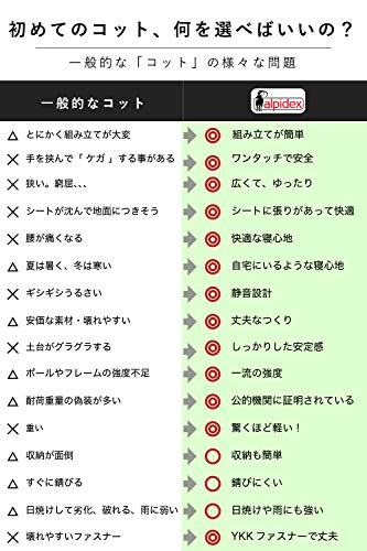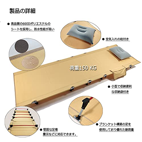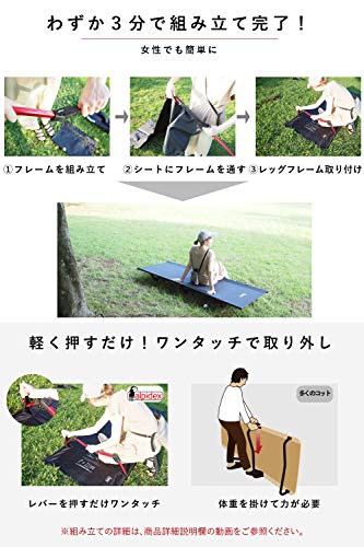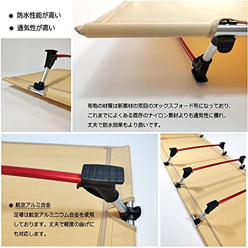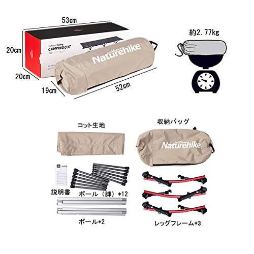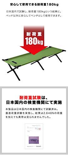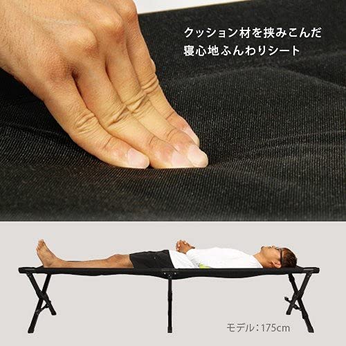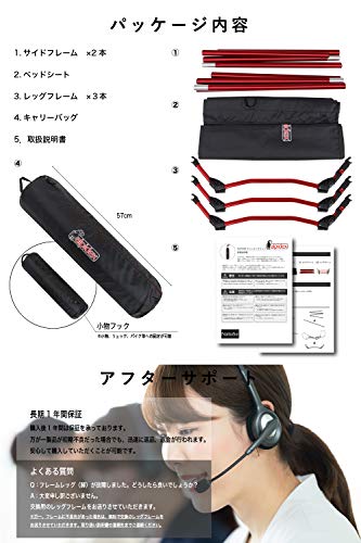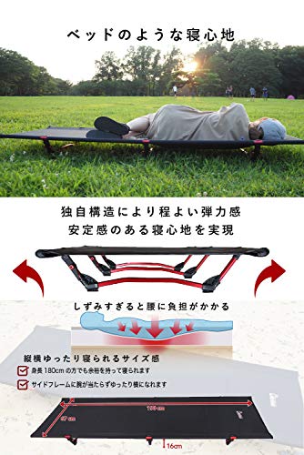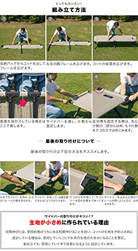 重量があってしっかりしている製品です。ちゃんと寝たいオートキャンパーにオススメだと思います。個人的に、コットの組立は意外と面倒くさい製品が多いと感じております。①まず特筆すべきは、袋から出してベッドの状態にするまで、1分以内にできる簡単さです。